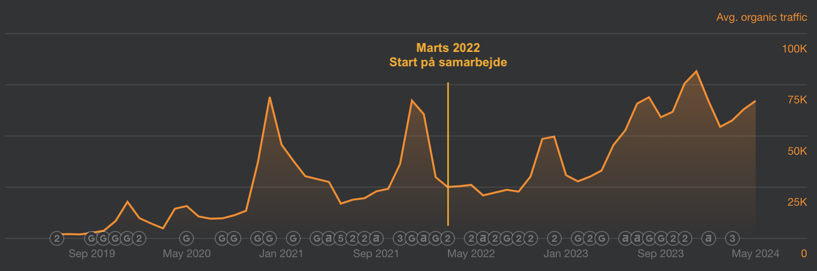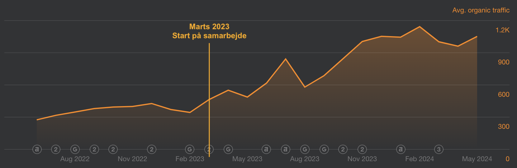 Grafen viser den opnåede vækst på trods af nedskaleringen fra 10 til 2 sprog på hjemmesiden. Hjemmesiden opnåede 24% vækst i den organiske trafik i februar (1.-28. februar 2024) sammenlignet med forrige år (1.-28. februar 2023) og mindre femcifret månedligt besøgstal fra Google.